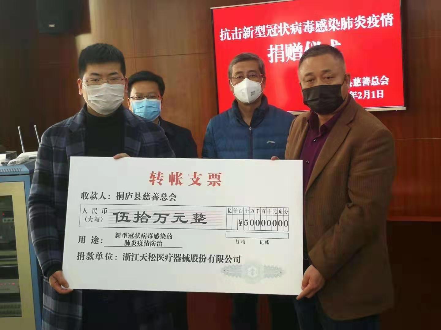 2月1日,浙江天松醫(yī)療器械股份有限公司向桐廬縣慈善總會捐贈50萬元人民幣,用于新型冠狀病毒感染的肺炎疫情防控工作,桐廬縣慈善總會領(lǐng)導(dǎo)現(xiàn)場接受公司捐贈。這筆捐款將主要用于購買抗擊疫情所急需的防護(hù)用品及藥品等物資。